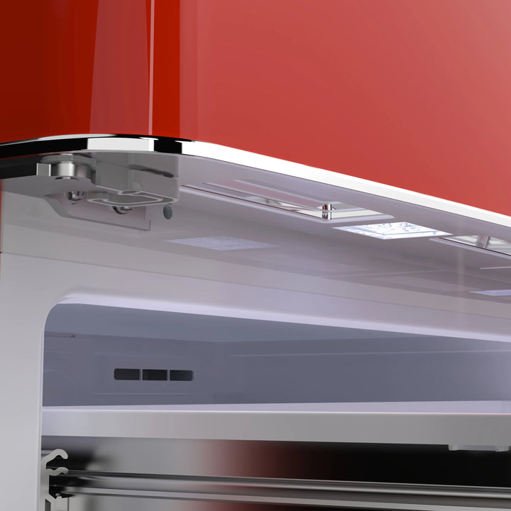 In StockAdd a pop of color to your kitchen with our 18 cu.ft. frost-free refrigerator in a bold red finish. Designed with a sleek, handle-free exterior, this model provides 12 cu.ft. of fresh food storage and a 6 cu.ft. freezer, featuring adjustable glass shelves, spacious door bins, and crispers for versatile organization. The Super Cool and Super Freeze functions offer quick cooling, while high-efficiency LED lighting ensures every item is easily visible. Enjoy hassle-free maintenance with the no-frost design and benefit from the stylish retro aesthetic that brings vintage charm to any space. Completed with a stainless steel back panel and modern silver trim, this ENERGY STAR-certified refrigerator is as efficient as it is eye-catching. Lower the cost of living with Forno.