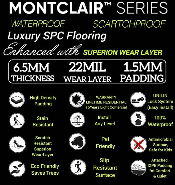 Transform your space with MONTCLAIR Palermo Valley premium vinyl planks, showcasing warm pecan hues with delicate textures and patterns for a refined, natural wood appearance. A refined flooring solution that blends elegance with resilience. With a thickness of 6.5MM and a sturdy 22MIL wear layer, this flooring is crafted to endure high-traffic environments while preserving its flawless appearance for years.
